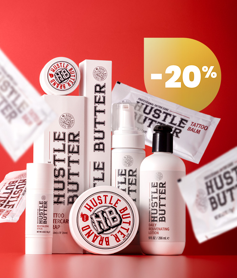 Quando se trata de creme para tatuagem, não podemos deixar de recomendar, Hustle Butter Deluxe pois é um dos melhores cuidados pós-tatuagem e que também podem ser usados antes e durante o processo de tatuagem! Também somos grandes fãs da Recovery Aftercare, e temos em stock o seu creme de cuidados pós-tatuagem, ligaduras e sabonete para cuidados pós-tatuagem.