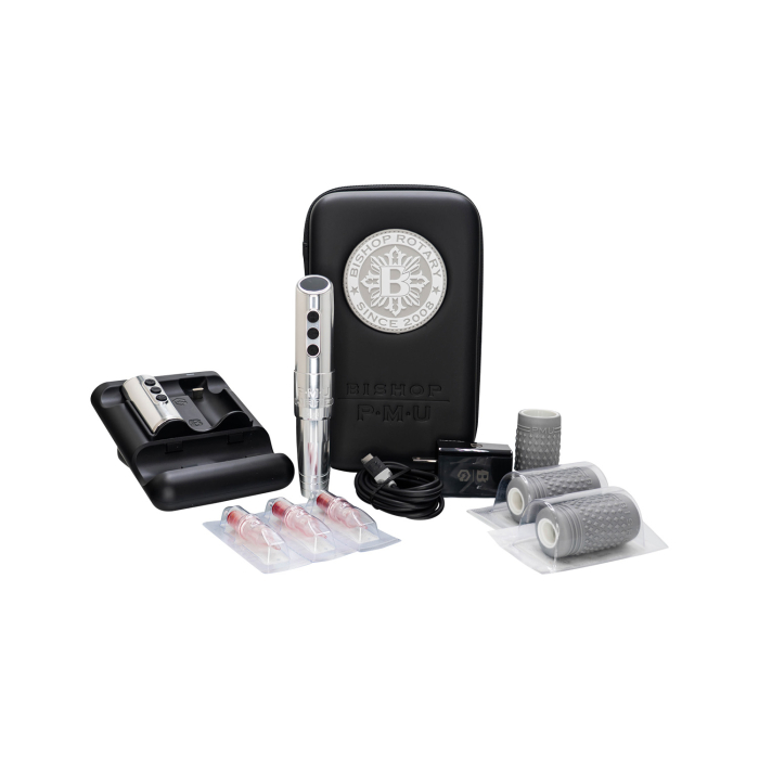 Se comprar o Bishop PMU Wand Full Set, receberá uma máquina Bishop PMU Wand, dois conjuntos de baterias, uma estação de encaixe com ranhuras para as baterias e para a máquina, e um cabo USB-C de 1,8 metros (6 pés) e um adaptador de parede para a fazer funcionar. Receberá também 3 grips descartáveis e 3 cartuchos de agulha, tudo num estojo de viagem com fecho, elegante e resistente!