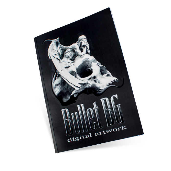 Percorra o livro de Bullet BG com 50 imagens digitais originais para tatuagens. Incluindo guerra, morte, rostos, religião e mitologia, veja como Bullet BG é capaz de manipular as suas imagens numa maravilhosa obra de arte digital.