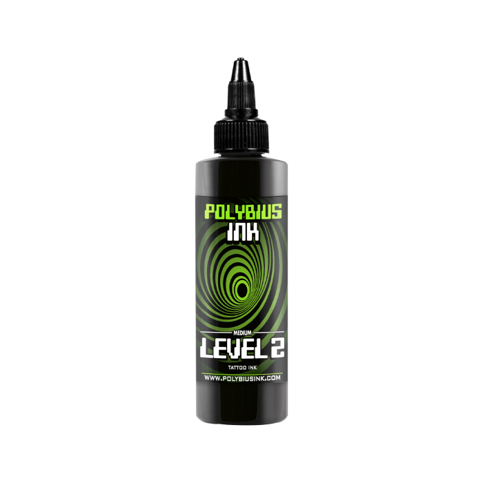 Medium Level 2 da Polybius Ink é uma tinta para tatuagem cinza médio, perfeita para a transição entre áreas claras e escuras. Pode ser usada sozinha ou diluída com Nível 0.