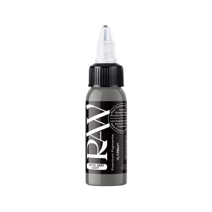 Metal Grey Light é uma tinta para tatuagem cinza muito suave que pode ser clareada ou escurecida e penetra facilmente na pele, da gama Platinum da Raw Premium Pigments, em conformidade com o REACH da UE.