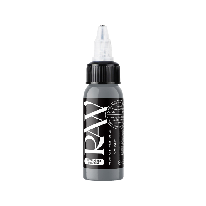 Metal Grey Medium é uma tinta para tatuagem sólida, cinza escuro, com um toque de cor patenteada para garantir que cicatriza sem tons de verde ou amarelo, da gama Platinum da Raw Premium Pigments, em conformidade com o REACH da UE.