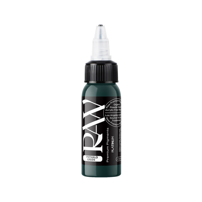 Phthalo Green é uma tinta para tatuagem verde escura e profunda da gama Platinum da Raw Premium Pigments, em conformidade com o REACH da UE.