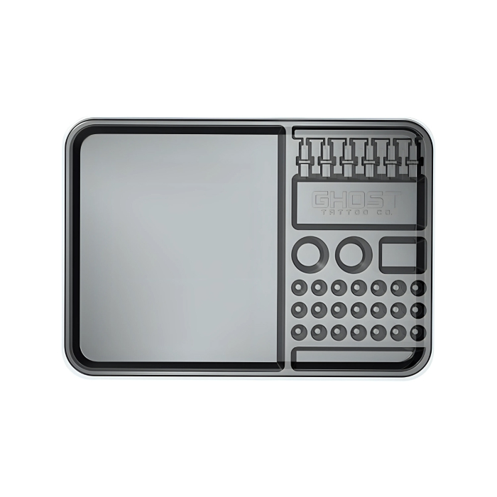 Estas bandejas em PET 100% recicláveis ajustam-se perfeitamente ao topo de tabuleiro Ghost padrão, com seções dedicadas para tudo o que necessita, incluindo 25 porta-copos de tinta, 6 ranhuras para cartuchos, 2 porta-copos de água, um porta-copos ou esponja adicional e uma ranhura para linhas de glide ou cuidados posteriores.