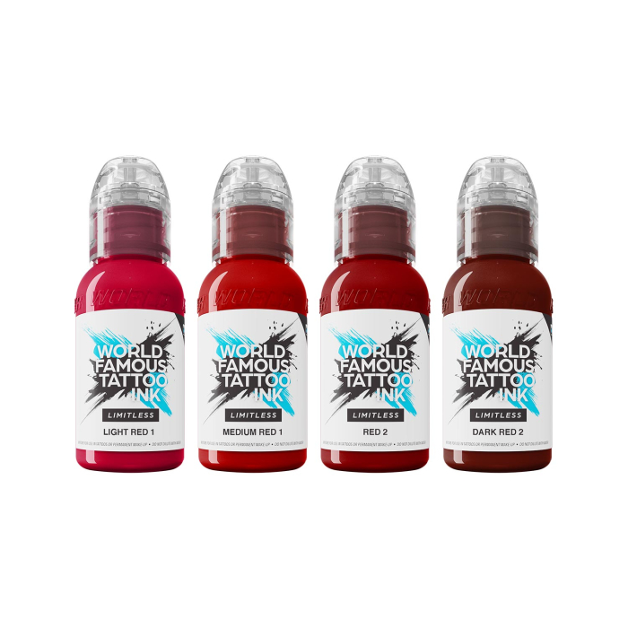 A World Famous Limitless Shades of Red Collection é um conjunto de 4 frascos com uma variedade de tintas para tatuagem vermelhas, todas em total conformidade com os regulamentos REACH atualizados da UE, introduzidos em janeiro de 2023.